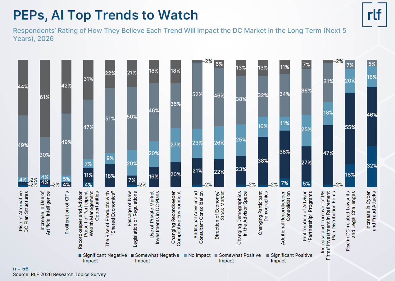 We recently completed our annual survey on retirement services providers’ top opportunities and concerns for 2026. Perhaps not surprisingly, AI, PEPs, private markets, and CITs all scored as top areas of focus in the new year. Equally unsurprising is that lawsuits and cyber threats remain top challenges. What is interesting, however, is that “execution” is an important undercurrent within the data and in many of the conversations we’ve had in the new year.
